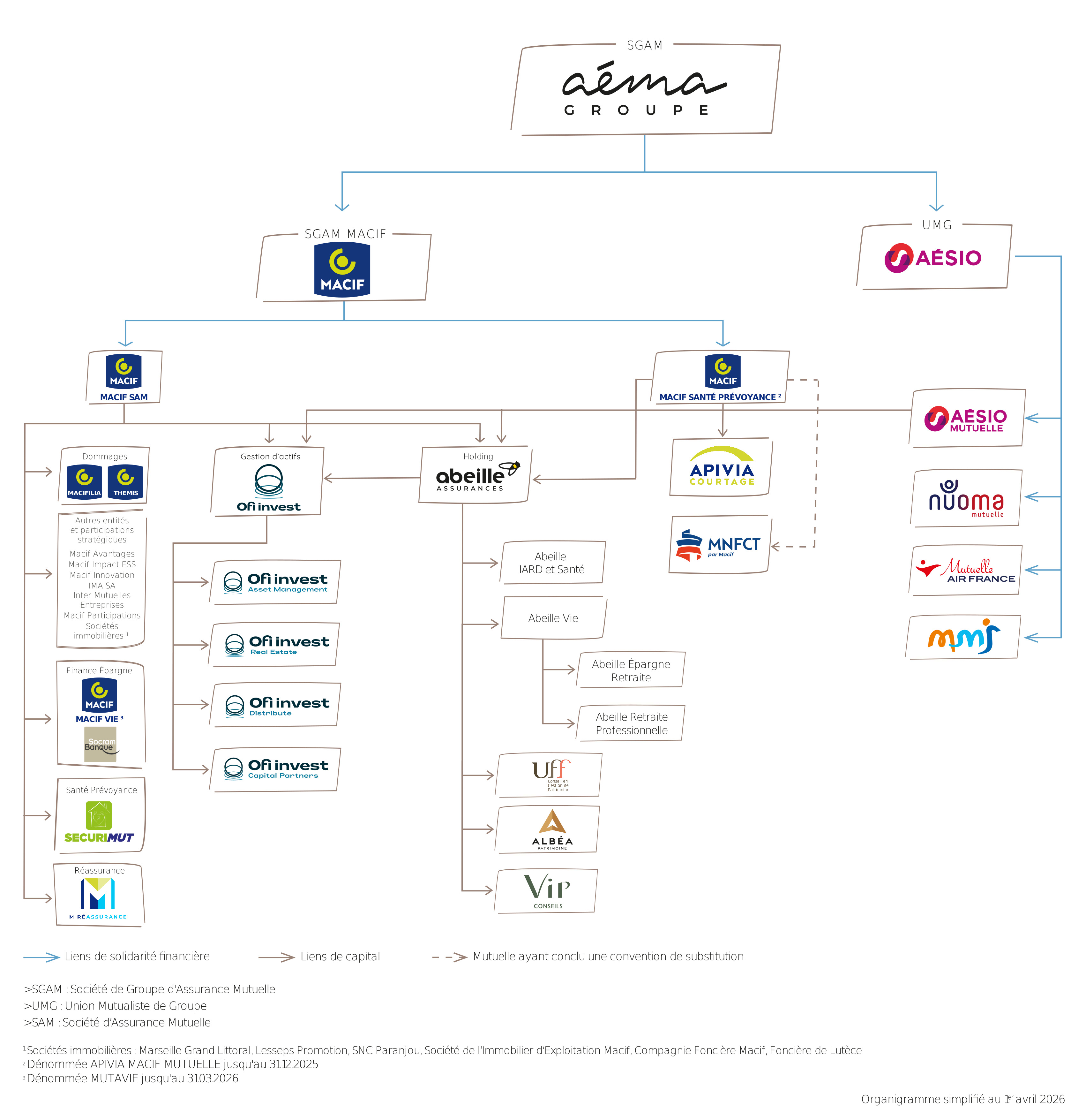 Le groupe est construit à cette fin autour de ses 4 marques principales (Macif, AÉSIO mutuelle, Abeille Assurances, Ofi Invest). Tête de groupe, la SGAM (Société de Groupe d’Assurance Mutuelle) assure le pilotage prudentiel et économique et veille à inscrire la pérennité de nos activités dans un temps long. Elle impulse et déploie les orientations stratégiques.